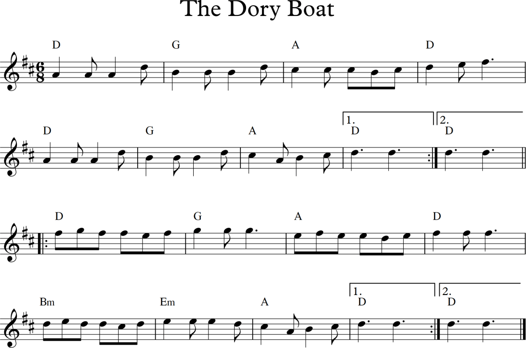 A tune to go with Rig a Jig Jig, this is The Dory Boat. It has a lot of the same melodic shapes and rhythms as Rig a Jig Jig, and lots of opportunity for trying out varying the tune in subtle ways. Here is a demo and a walk through of the tune: