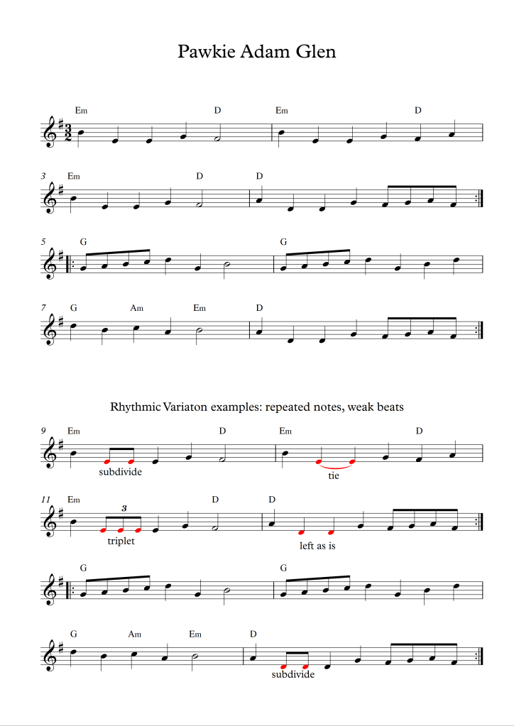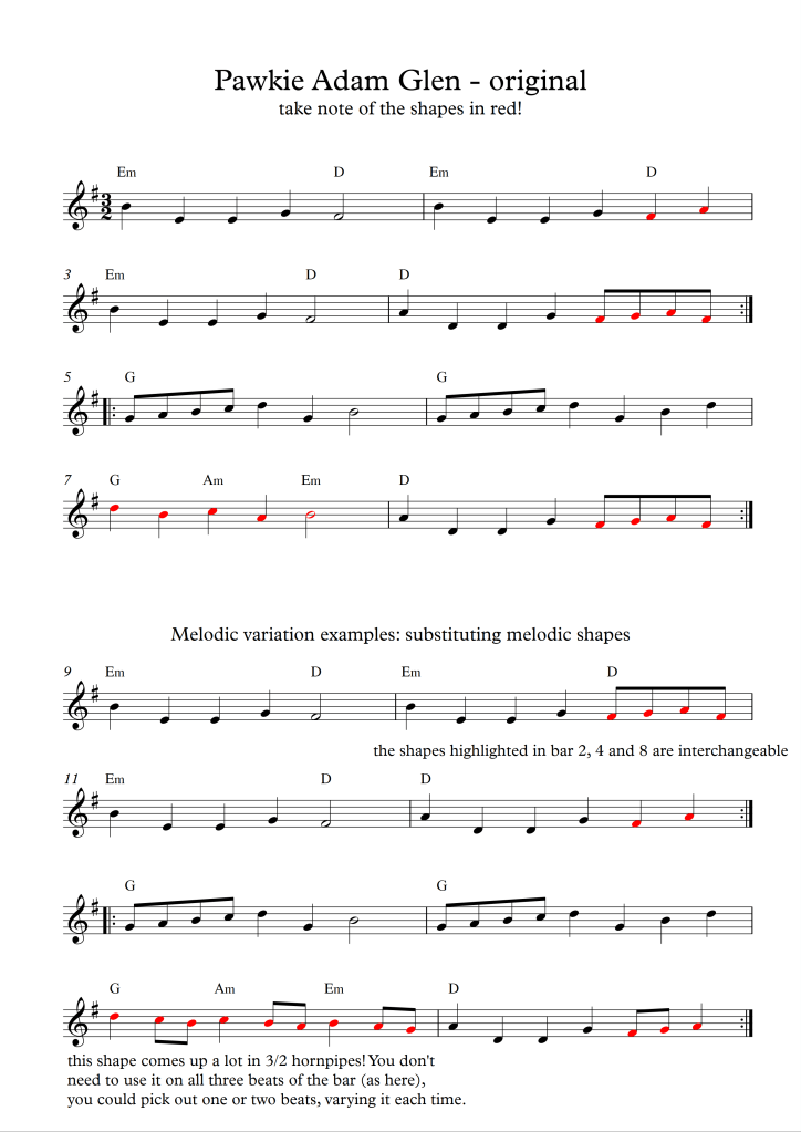 In addition to the rhythmic variations we covered last week, there are some nice melodic variations available in this tune. Our first idea was to substitute existing melodic shapes for others in the tune, for example in bars 2, 4 and 8. The second involved substituting a figure that often comes up in 3/2 hornpipes. Have an experiment, try these and the rhythmic variations and find what works for you!