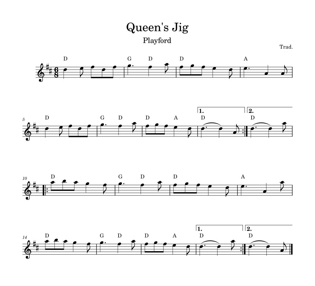 You’ll notice that the chords don’t resolve the D at the end of each section – this is on purpose! We often think of a 32 bar tune as being just that but in reality the tune will be played four or five times in a row, and so the constant return to the tonic key at the end of each section can become somewhat tedious. While we won’t use the G chords every time, this serves as a reminder to think of the whole arc of the repeated tune and not just the short, written down tune that we see in the notation.
