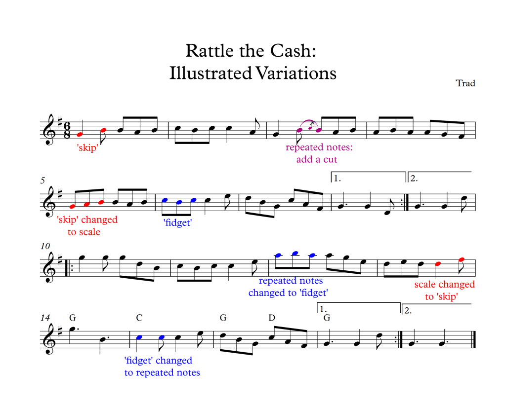 We looked at three main ideas for varying Rattle the Cash, which are all applicable to other jigs. Firstly, looking for ‘skips’, aka intervals of a third – you can add the note in the middle to make a scale, smoothing out the melody. Or, vice versa, take the middle note out of a scale to make the tune more bouncy. Secondly, look for ‘fidgets’, aka auxiliary notes – take out the middle note for make the tune bouncier or add a fidget note in between two repeated notes to make the tune smoother. Lastly, we tried adding a ‘cut’ ornament in between repeated notes. This works best when you keep the repeated notes in the same bow/breath/bellow direction.