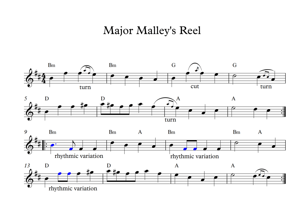 We experimented with adding turns in places where the tune moves by step, and double cuts on the stronger beats of the bar (beat one and beat three).