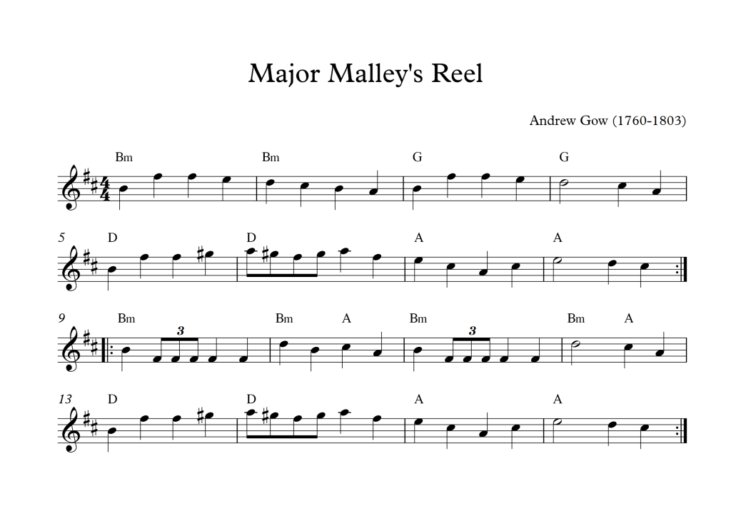 Major Malley’s Reel, aka Major Molle’s, is a Scottish tune by Andrew Gow first published in 1809 shortly after Gow’s death. Molle was an officer in the British army. The tune has since traveled to Canada and England, and we know it was still in use in the 1800s in England, as Thomas Hardy referenced the tune in his 1874 novel Far From the Madding Crowd.