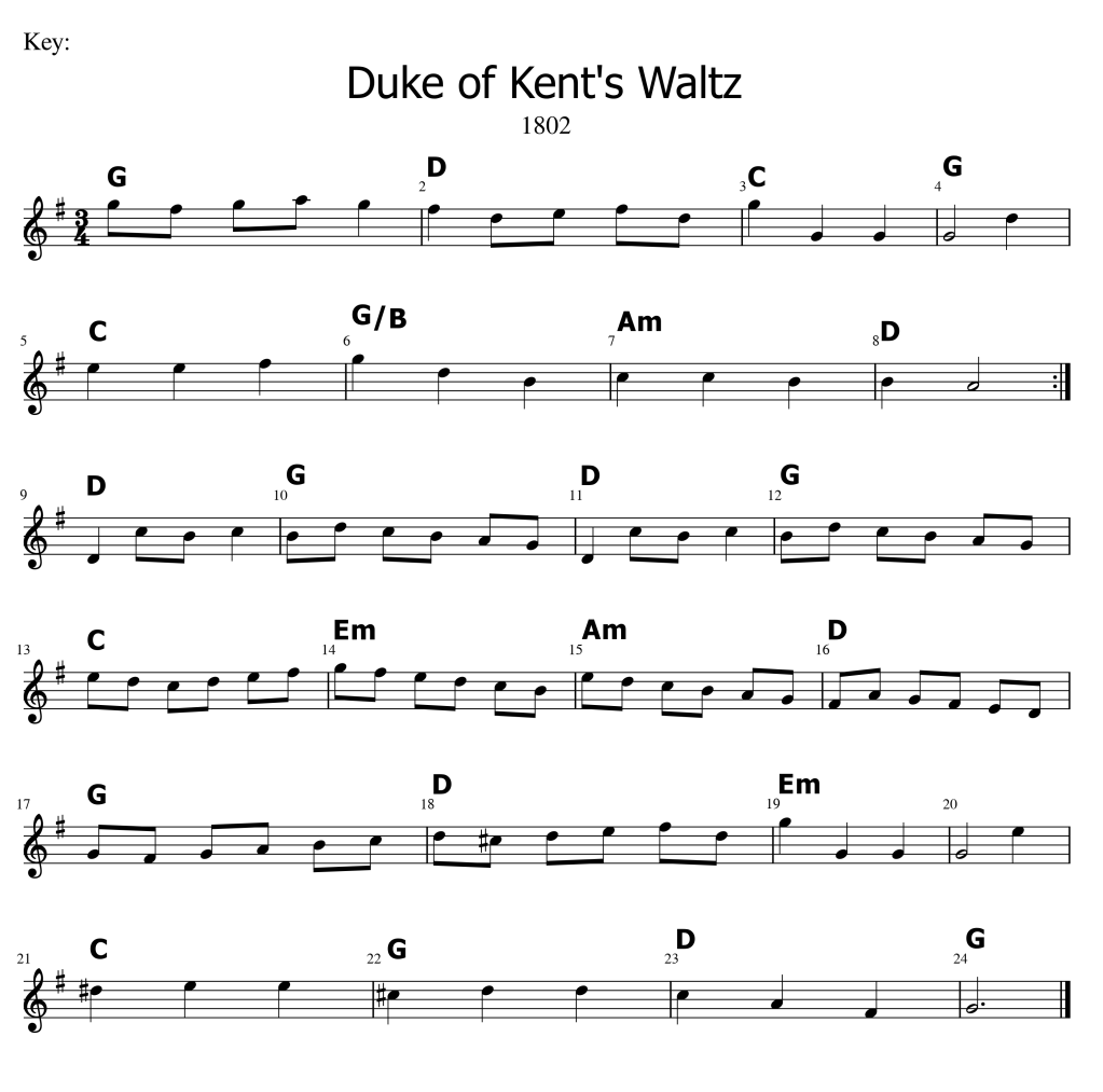 Here is the tune that we will be looking at Nov 4th, Duke of Kent’s Waltz. It’s an English Country Dance Tune from the early 1800s. Updated to include the PDF 12/11/24.