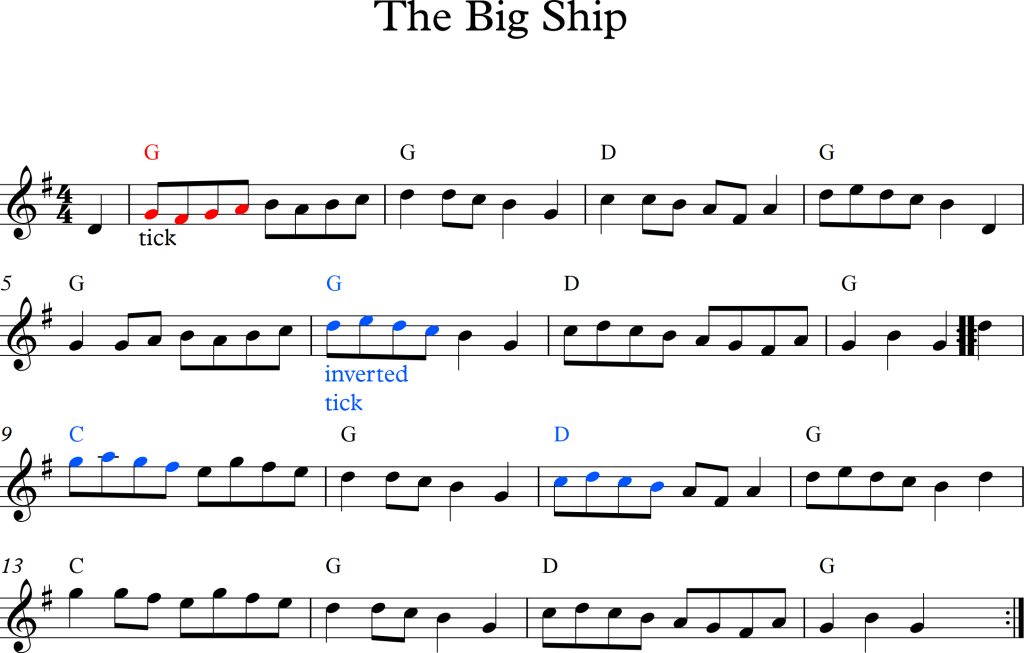 By melodic figure, I mean a short pattern of notes that makes one particular tune to sound like that particular tune. For instance, in The Big Ship there is a melodic figure at the end of the first bar that we ended up calling a ‘tick’ (because if you were to connect the dots, you would create a tick shape):